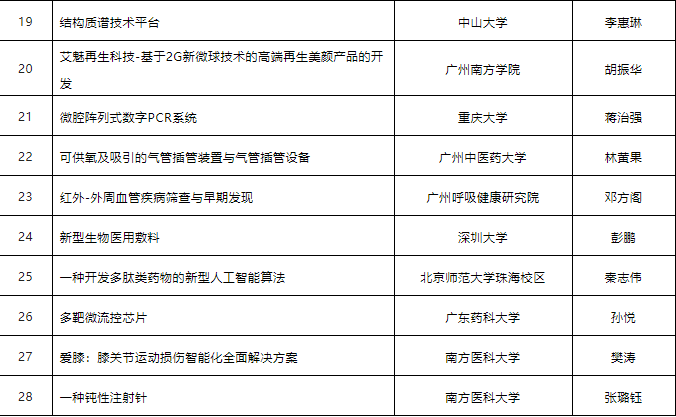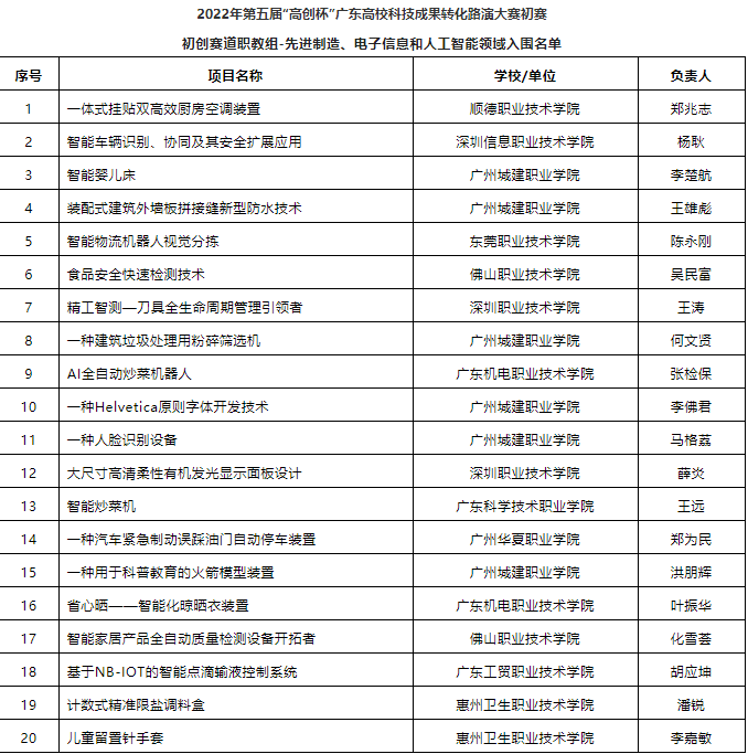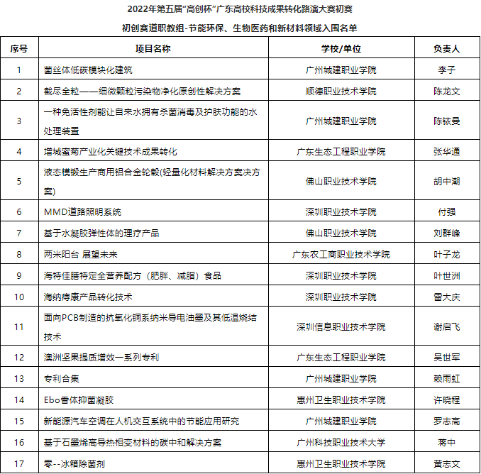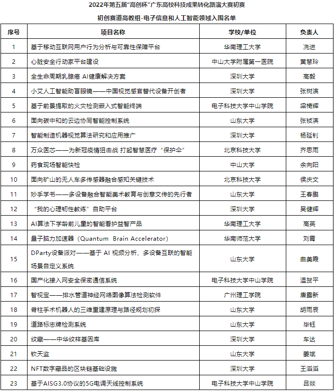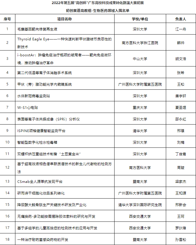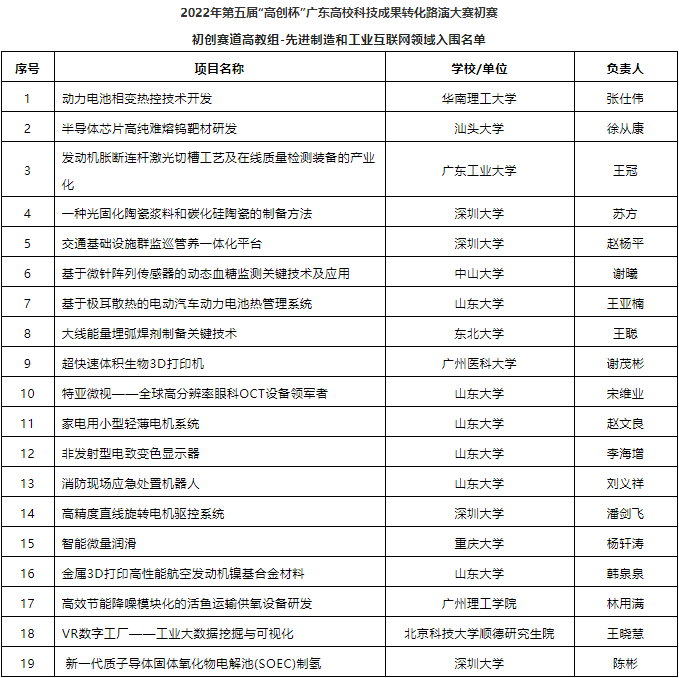 以下為2022年第五屆“高創(chuàng)杯”廣東高校科技成果轉(zhuǎn)化路演大賽入圍初賽項(xiàng)目名單